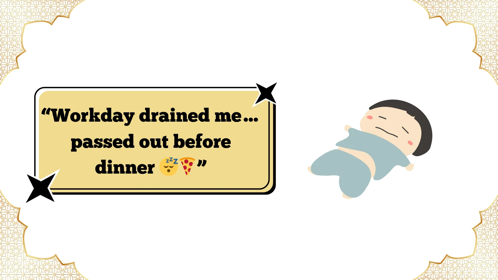 - Instagram Story caption: “Workday drained me… passed out before dinner 😴🍕”